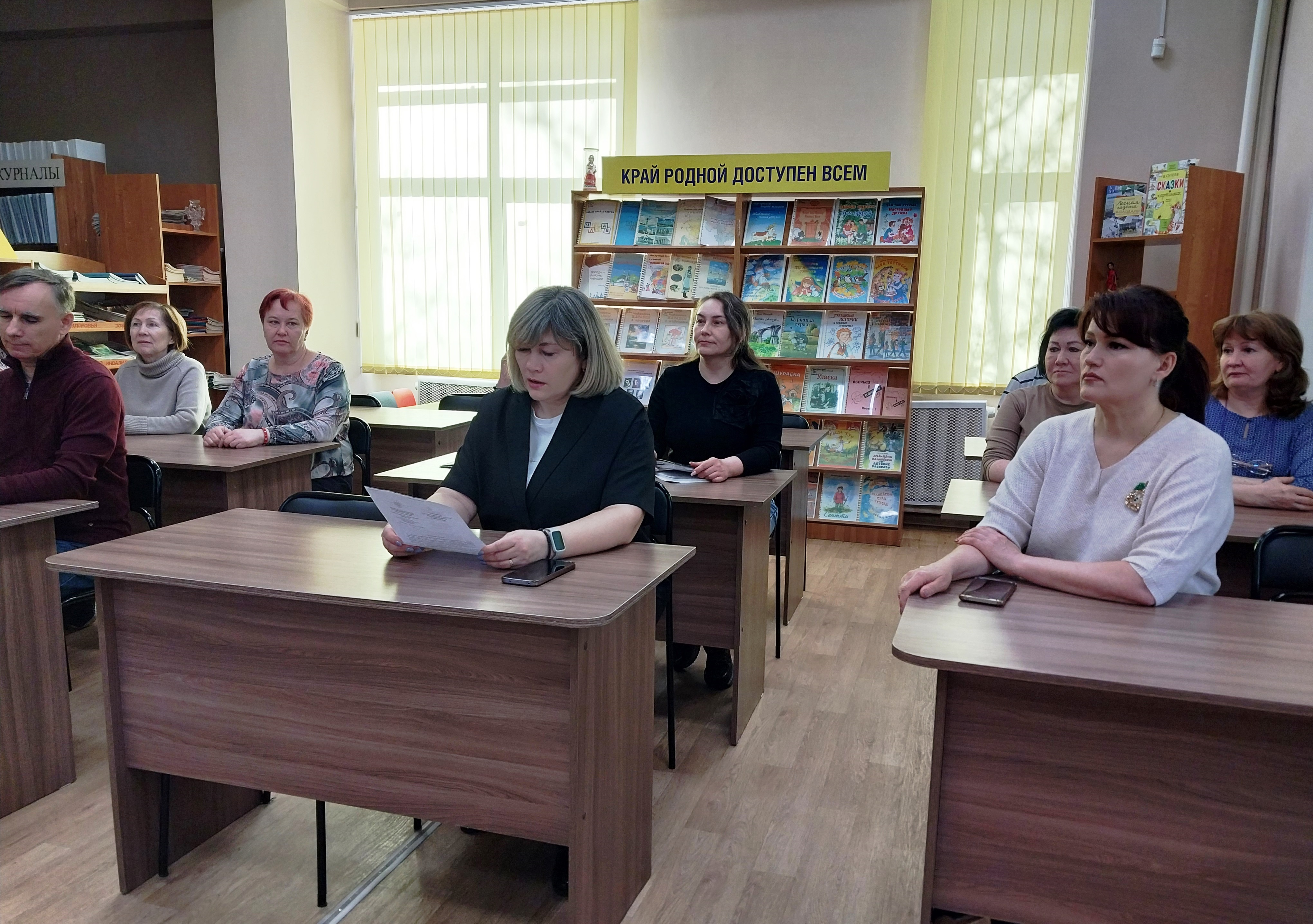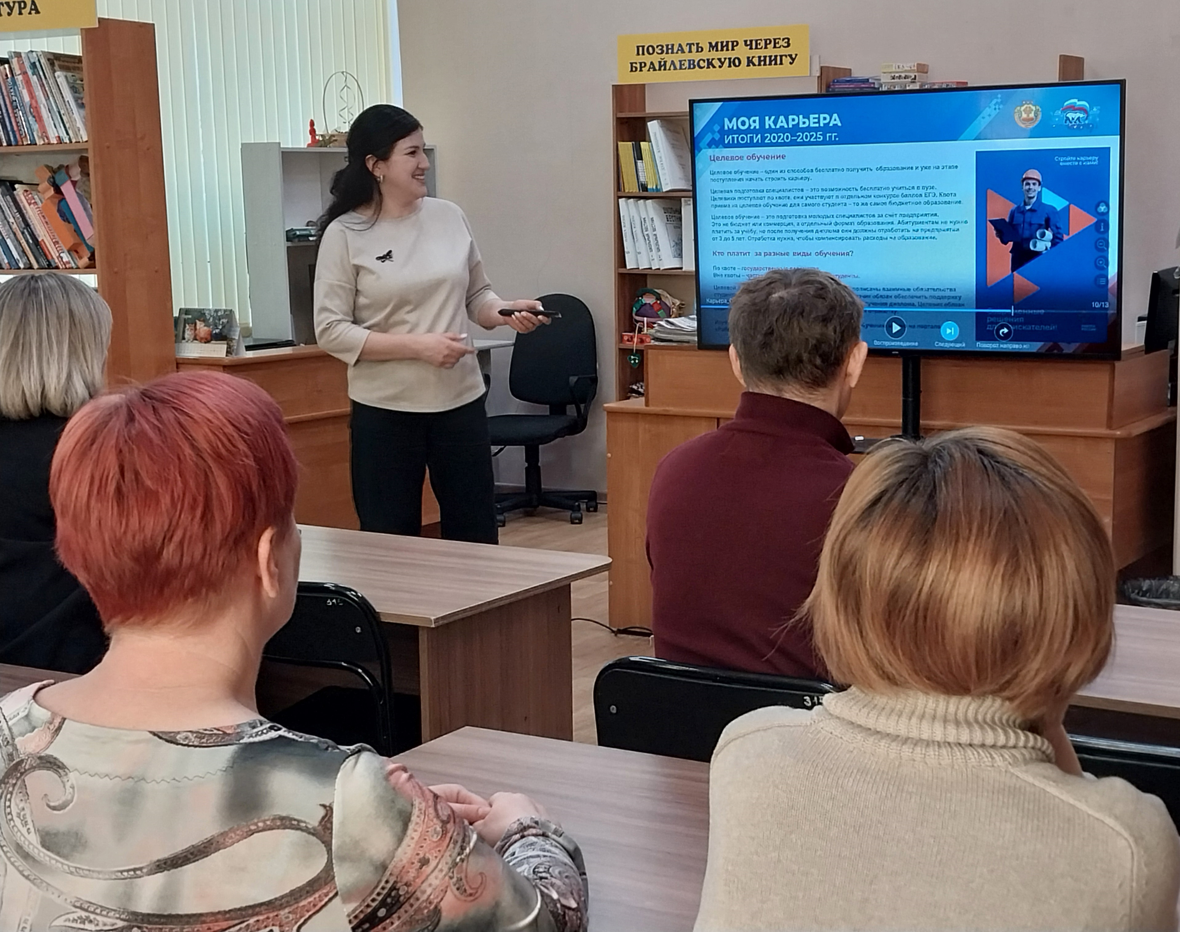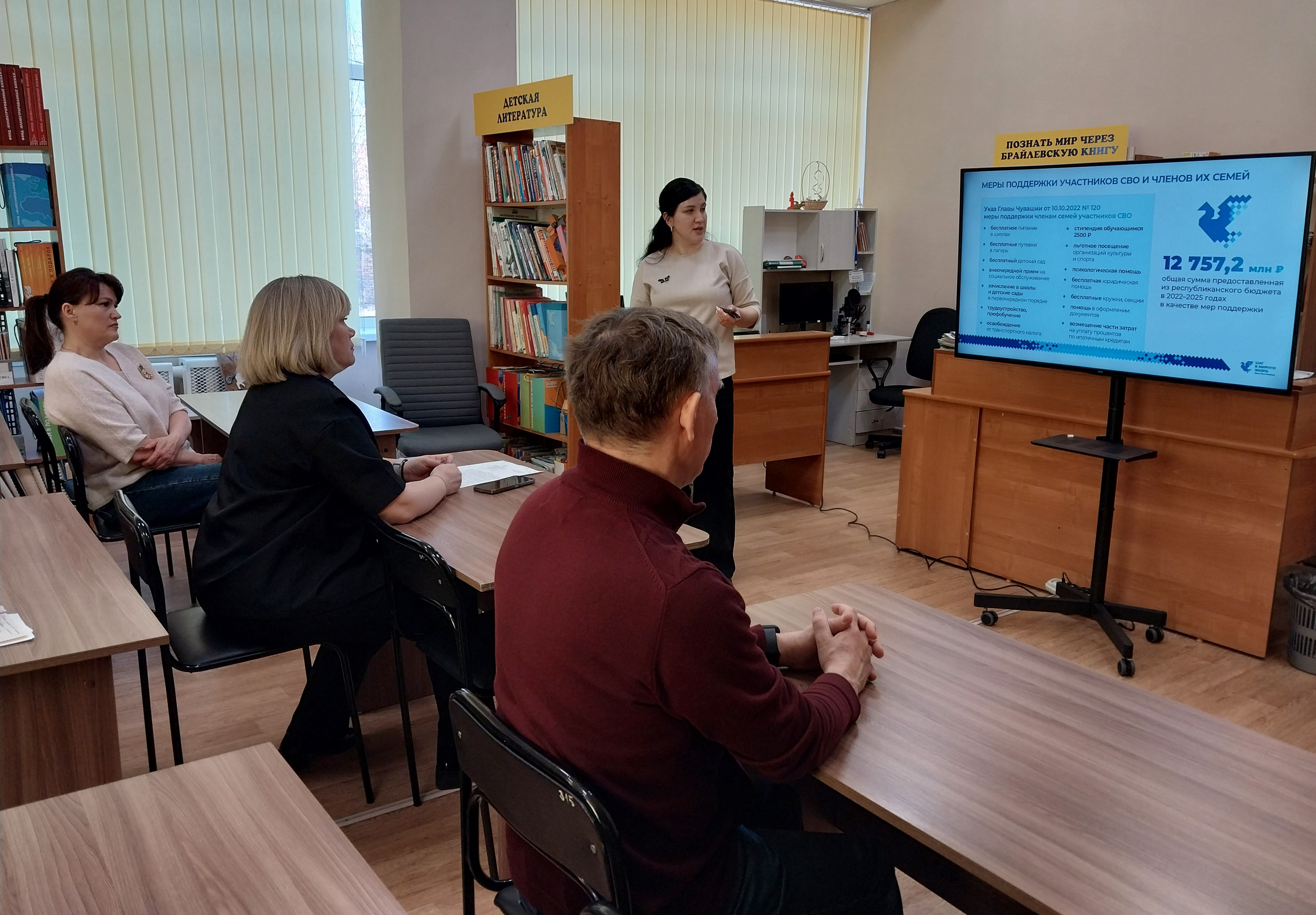 Отдельный блок был посвящён поддержке участников специальной военной операции и членов их семей. Сотрудников библиотеки познакомили с промежуточными итогами проекта «Шаг в мирную жизнь», который в 2026 году стал самостоятельным региональным партийным проектом «Единой России». Проект направлен на оказание комплексной помощи ветеранам СВО: медицинскую реабилитацию, трудоустройство, переобучение, юридическое сопровождение и решение социально-бытовых вопросов.